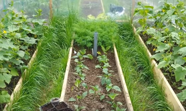 Грядки в теплице шириной 3 метра можно делать по 65 см, при этом получатся два удобных просторных прохода, а все растения на грядках будут в свободном доступе.