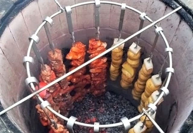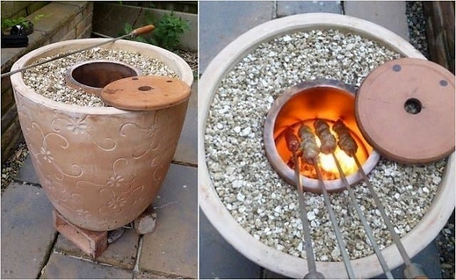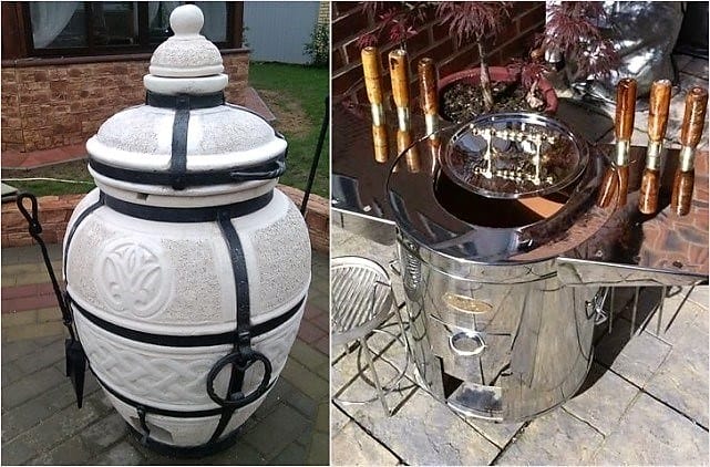 Переносных печей «типа тандыр» существует огромное множество. Некоторые из них весьма отдаленно напоминают классическую конструкцию. Блестящее ведро на фото, больше похожее барную стойку, — один из вариантов переносного тандыра. Куда более красивый и этнически безупречный образец переносного очага — тандыр, выполненный из керамики. Такой объект, кроме своей прямой функции, станет отличным художественным дополнением приусадебного участка.