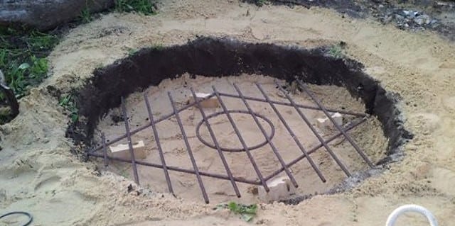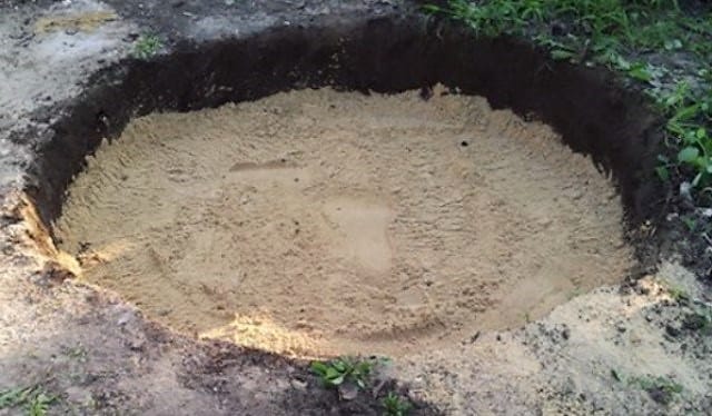 Шаг 1– подготовка круглого котлована под фундамент. Его глубина 20-30 см. На дно следует насыпать слой песка толщиной 10 см и утрамбовать его.