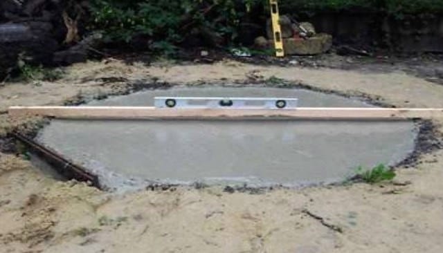 Шаг 3 – бетонирование подготовленного основания. Сырой бетон нужно уплотнить вручную или виброрейкой и проверить уровнем горизонтальность поверхности.