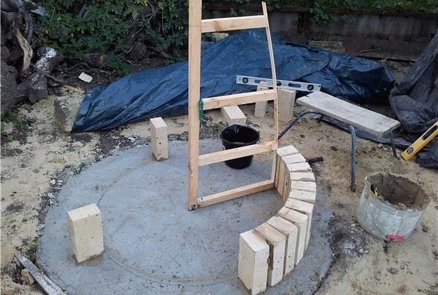 Шаг 4 — через неделю, когда фундамент наберет прочность, на нем вычерчивают наружный контур будущей печи и ставят на раствор первый ряд кирпичей. Для кладки следующего ряда нужно сделать шаблон из реек. С его помощью можно легко контролировать угол наклона кирпичей, формирующих стенку.