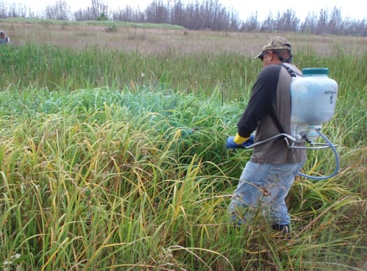 К безвредным для окружающей среды можно отнести следующие препараты: «Раундап» (универсальное средство от всех сорных трав), «Торнадо» (против вьюнка, пырея ползучего, тростника, свинороя и рогоза), «Граунд Био» (универсальный препарат). Их распространяют на вегетативные органы сорняков, конечный результат уже виден примерно через 1-3 недели. Нельзя забывать о средствах индивидуальной защиты при использование химических препаратов (перчатки, маски, специальная одежда).