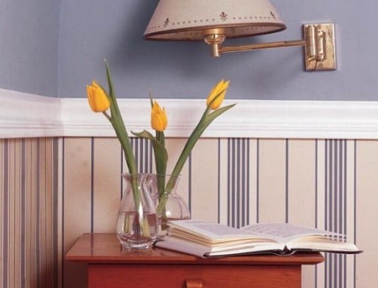 Любители классических интерьеров могут смело применять горизонтальное деление стен двумя видами обоев с использованием бордюра: бумажного, из полиуретана или дерева.