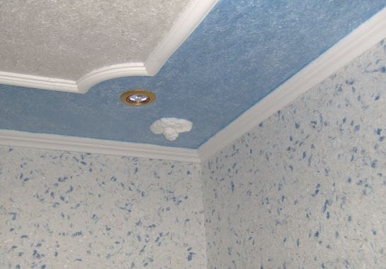 Считается, что оклеивать обоями потолки уже не модно. Однако можно воспользоваться «жидкими обоями». С помощью данного материала можно оформить как стены, так и потолки, подобрав составы гармонирующих между собой цветов.