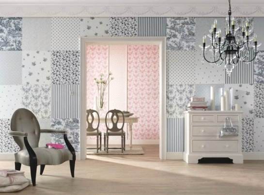 В последнее время в продаже можно встретить обои, уже имитирующие лоскутное одеяло, но квадраты на них более мелкие. Создавая композицию самостоятельно, вы сможете расчитать необходимый для вашего помещения рапорт и подобрать подходящие рулоны обоев.