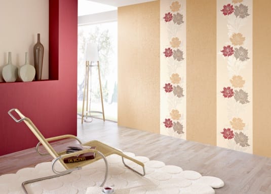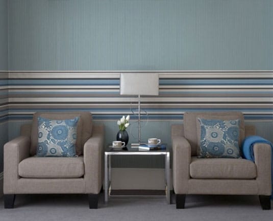 Оклеить стены обоями двух видов можно, чередуя полотна между собой. Полосы могут быть в одной цветовой гамме и отличаться лишь рисунком, либо создавать контрастное чередование из светлых и темных вставок.