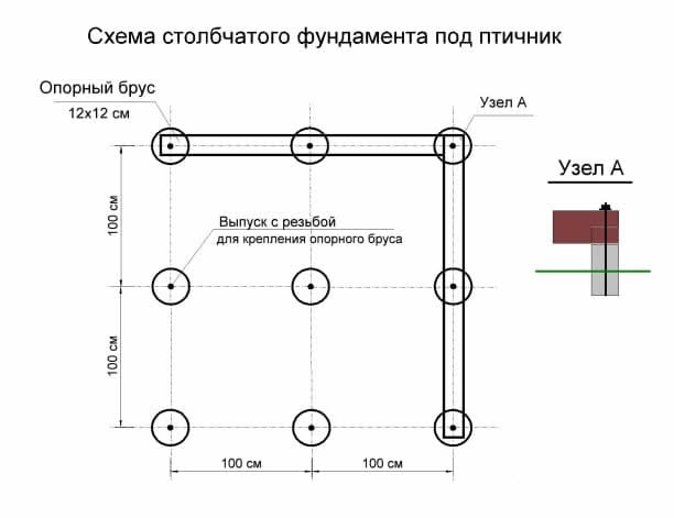 Перед бетонированием в опалубку ставятся арматурные стержни диаметром 12-14 мм, по 2-3 штуки на каждый столбик. Шаг столбиков для птичника размером 2х2 метра составляет 1 метр. Один из арматурных стержней должен иметь конец с нарезанной резьбой под гайку. Он нам понадобится для крепления опорного деревянного бруса, на который будет уложен пол.