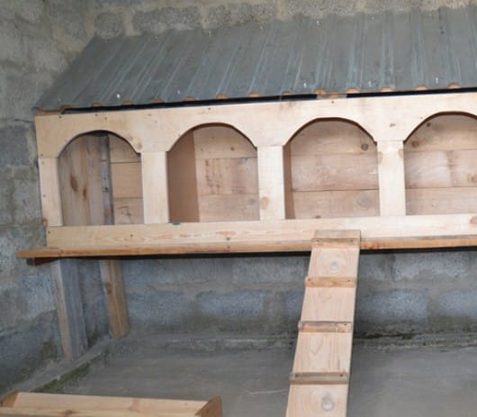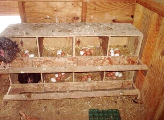 Гнездовья для птицы можно разместить непосредственно в курятнике, но лучше частично вынести их наружу, снабдив подъемной крышкой или дверцами.