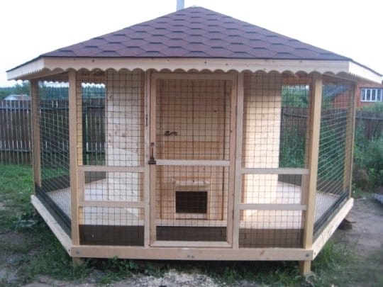 Геометрические пропорции вольера лучше всего привязать к размерам домика. Поэтому, если жилище для 10 несушек у вас будет шириной 2 метра, то выгул для них нужно сделать размером 2х5 или 2х7 метров.