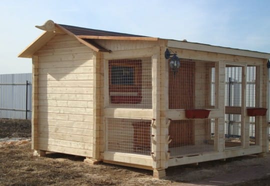 Еще один неплохой вариант – стены из бревен или бруса. Они теплые, прочные, легко собираются и отлично выглядят. Особенно хорошо смотрится птичник-сруб на усадьбе с жилым домом из такого же материала.