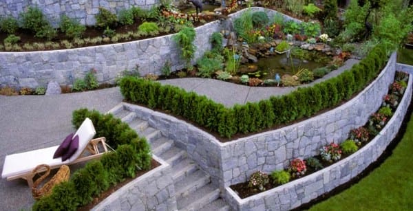 Участок при этом можно разбить на несколько ярусов, организовав на каждом из них зону отдыха, сад и огород, разделив их подпорными стенками или укрепленными откосами, объединив лестницами и пандусами.