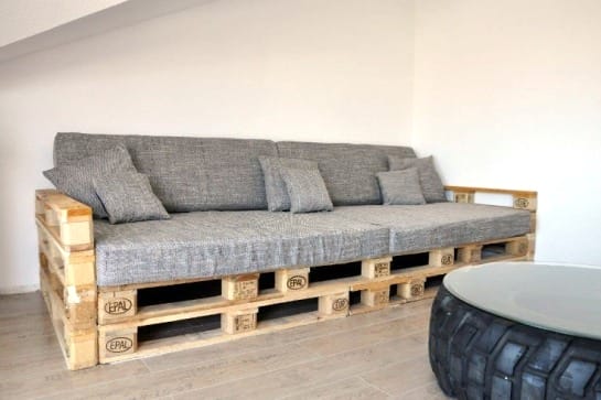 Деревянные поддоны не зря привлекают внимание домашних мебельщиков. Это готовые прочные модули. Из них можно с минимальными затратами средств и времени соорудить оригинальное ложе. Диван из поддонов, сделанный в нарочито грубом модном стиле «лофт» прекрасно смотрится с колесом от самосвала, выполняющим функцию журнального столика.