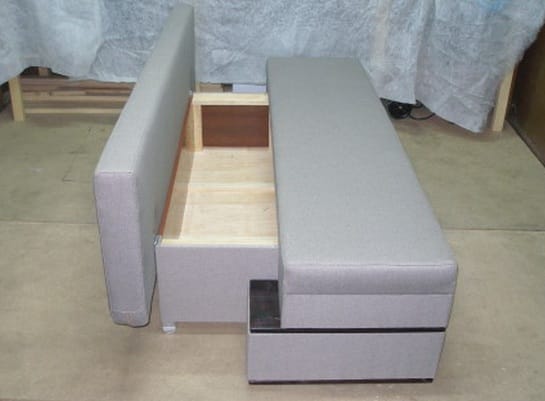 Размеры подушки сиденья должны быть равны размерам площадки выдвижного ящика. Выдвинув ящик нашего углового дивана, мы снимаем подушку спинки и укладываем ее вместо матраца.
