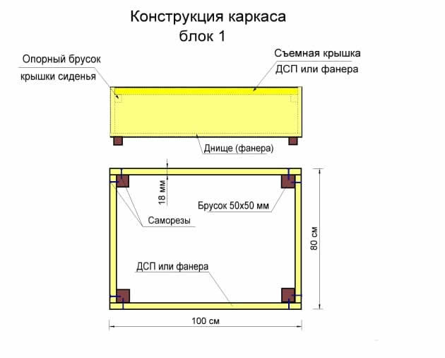 Основанием каждого блока углового дивана служит рама из фанеры или плиты ДСП, закрепленной на брусковом каркасе. Если толщина плиты достаточно большая (от 16 мм), можно обойтись без бруска. В этом случае саморезы заворачивают непосредственно в торцы плит, высверлив в них направляющие отверстия небольшого диаметра для исключения раскалывания материала.