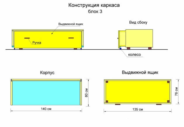 По конструкции блоки №1 и №2 одинаковые, а вот блок № 3 мы сделаем с выдвижным ящиком-сиденьем, увеличивающим полезную площадь дивана. Это самый простой вариант, не требующий установки механизмов трансформации (выдвижных или поворотных). Их правильный монтаж и регулировка для новичков – сложный процесс.