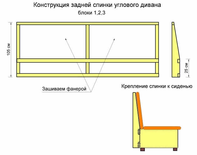 Без подробной сборочной схемы приступать к этой работе нельзя. Угловой диван состоит из нескольких частей, изготовление и стыковка которых требует точности. Лучший крепежный материал для новичка – саморезы. Шиповые соединения каркаса — уровень опытного столярного мастера.