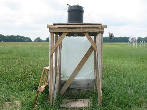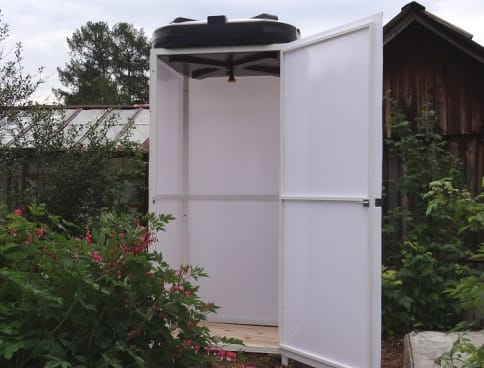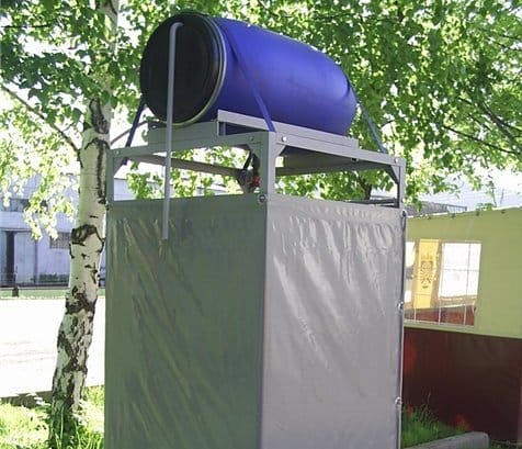 Такую установку можно использовать даже без строительства душевого домика, а закрепить ее на обычной летней кабинке без крыши.