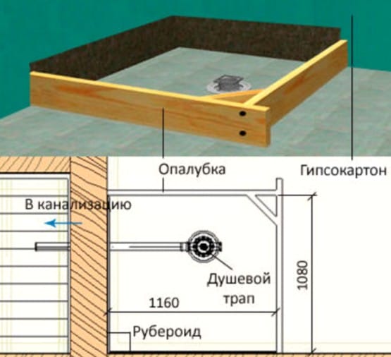 Идея этой конструкции очень простая – отгородив опалубкой или кирпичной кладкой часть пола, на нем укладывают трубы канализации, водоприемную воронку и трап (схема № 1).