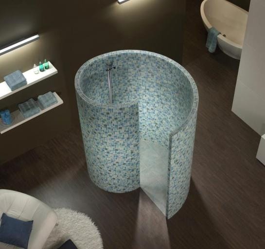 Мозаичная облицовка, непромокаемая ткань, ниспадающая плавными складками и подвешенная на хромированной дуге, превращают обычный душ в произведение дизайнерского искусства.
