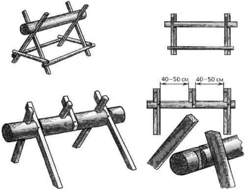 Козлы для пилки дров двуручной пилой должны отвечать двум главным требованиям: устойчивость и прочность. Дело в том, что процесс ручной резки сопровождается попеременными сдвигающими усилиями, которые расшатывают станок и могут вызвать его опрокидывание. Поэтому Х-образные стойки, скрепленные между собой продольным брусом или металлической затяжкой, должны быть изготовлены из качественной древесины толщиной не менее 100 мм.