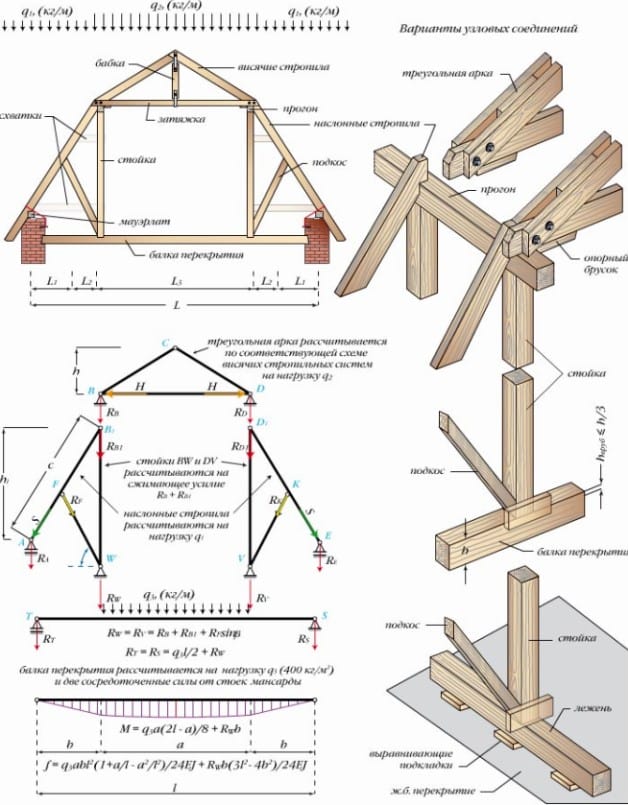 Является несущей основой мансардной кровли и должна выдерживать не только собственный вес, но также расчетные ветровые и снеговые нагрузки. Стропильная система мансарды связывает воедино балки перекрытия, кровельные скаты, стены и потолок. Это обстоятельство требует грамотного расчета и умелой реализации.