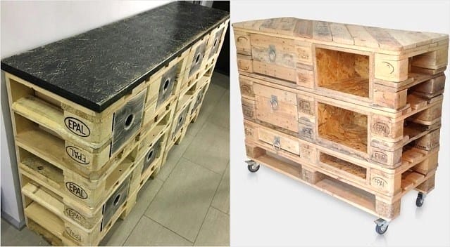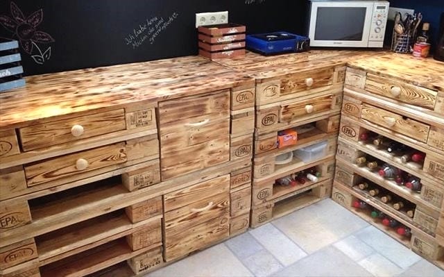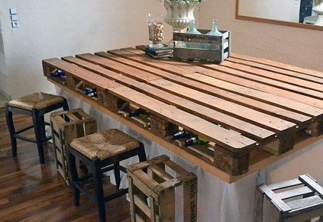 Из поддонов можно сделать красивую и функциональную мебель для кухни, прихожей, гостиной и спальни. Кухонная мебель представлена полками для бутылок, шкафчиками и столами.