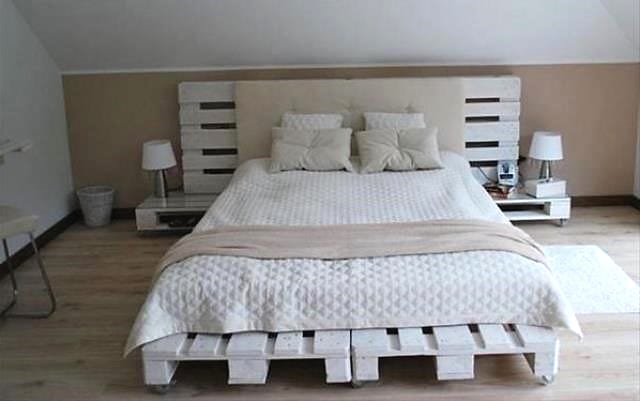 Спальная комната чаще всего ассоциируется с просторной кроватью, сделать которую также можно из паллет. Она может быть односпальной, двуспальной, двухъярусной, высокой или низкой, с изголовьем или без, с полками-тумбами, с подсветкой или классической. Подробнее об этом направлении можно узнать в отдельной статье, размещенной на сайте.