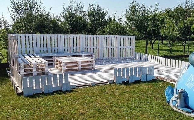 С помощью паллет можно оформить целую зону отдыха. Помимо традиционных элементов для такой зоны — диванов, лежаков, столиков, из них можно изготовить настил и ограждение.
