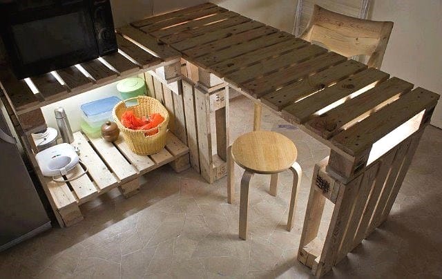 Самодельная мебель не всегда проста в изготовлении. Опытным мастерам можно поставить перед собой более сложную задачу — изготовить кухонный гарнитур. Основная сложность будет заключаться в точности разметки и в большом объеме работ по подготовке и стыковке паллет.
