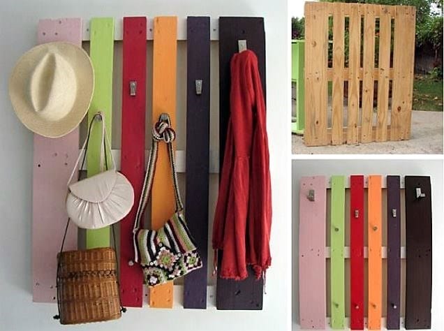 Прихожую украсит стильная вешалка для сумок и одежды. Для ее изготовления необходимо отпилить лишние детали (оставить только верхнюю часть) и покрасить обработанное дерево яркими цветами, согласно цветовой гамме вашего интерьера.