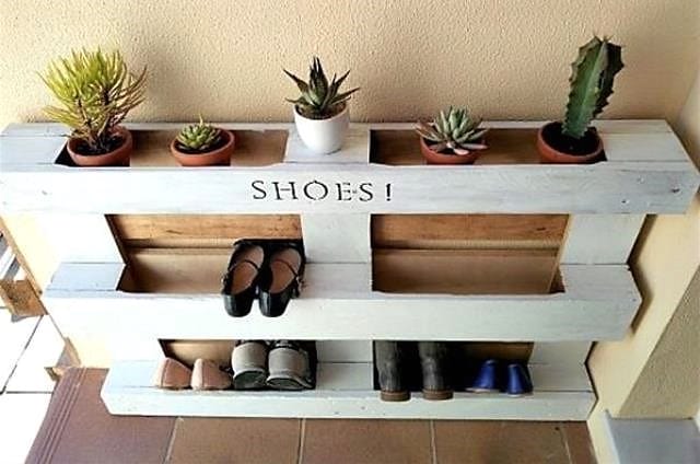 В дополнение к вешалке можно сделать компактную обувную полку. При этом поддону достаточно придать дизайнерского оформления.