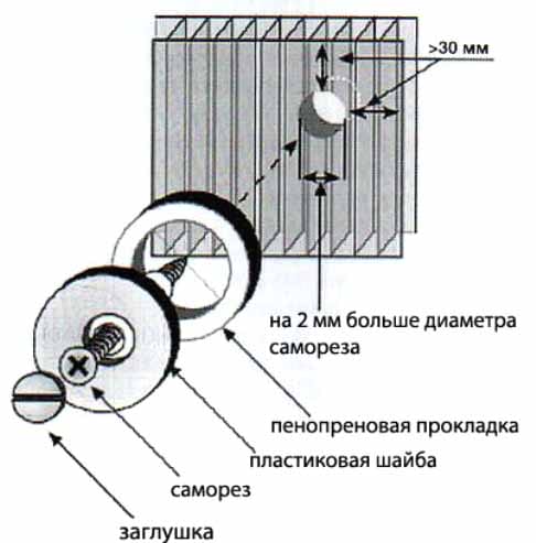 К деревянному каркасу сотовый поликарбонат крепят с помощью обычных саморезов, используя герметичные термошайбы, окраска которых соответствует цвету листа.