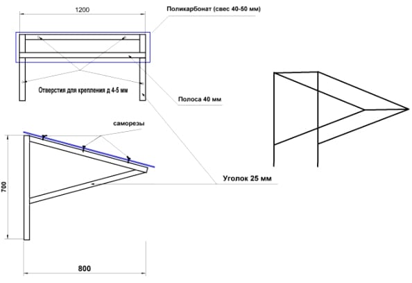 Монтаж такого козырька состоит в креплении каркаса при помощи дюбелей к стене. Для того, чтобы удобнее было закручивать крепеж к верхнему уголку, поликарбонат лучше закрепить после того, как основа под него будет надежно зафиксирована к стене.