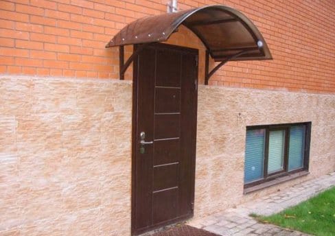 Если на первом плане стоит не цена, а качество дизайна, то козырек из сотового поликарбоната на алюминиевом каркасе будет идеально гармонировать с входом в веранду или оранжерею с большой поверхностью остекления. Еще один удачный вариант его установки – фасад, облицованный металлическими сэндвич-панелями.