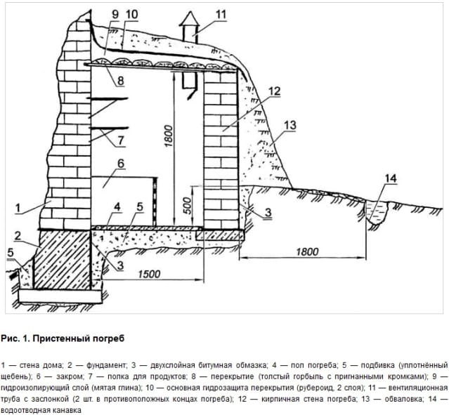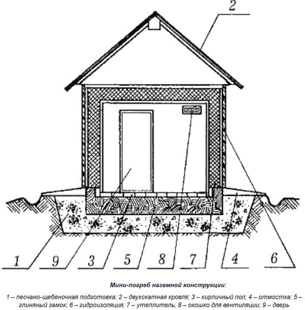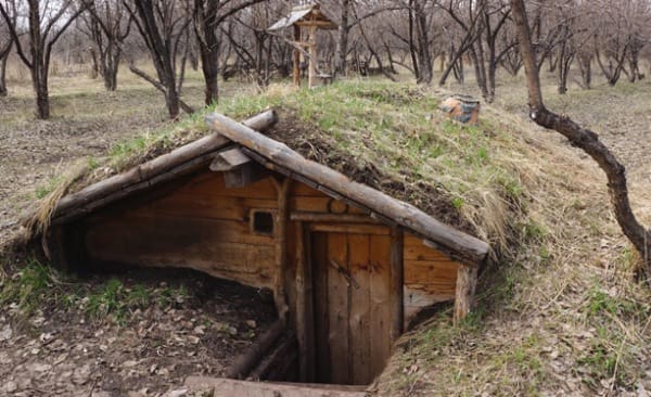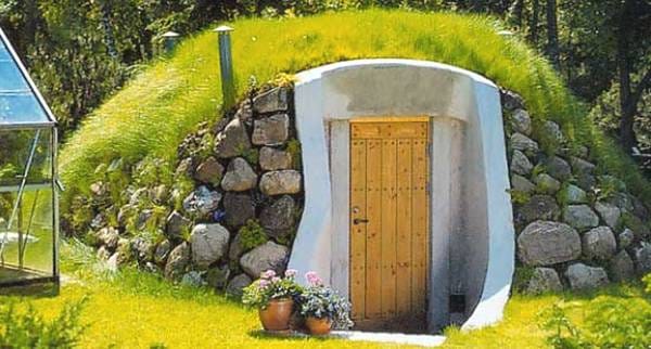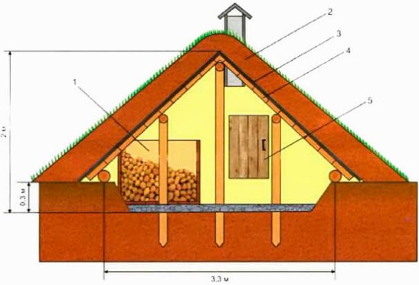 Если максимальный уровень подъема почвенной воды находится на глубине 1,5-2,0 метра, то строение заглубляют в грунт на половину его высоты. При глубоком залегании водоносного пласта хранилище можно полностью вкопать в грунт, оставив на поверхности пологую крышу, покрытую дерном.