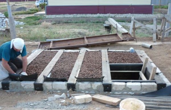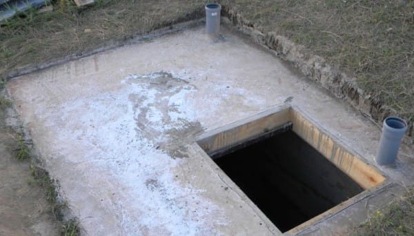 Сделав песчано-щебеночную подготовку и установив арматурную сетку, днище заливают бетоном. Следующий этап – прокладка электропроводки, обмазка шифера и каркаса битумной мастикой. Работы завершает бетонирование перекрытия и обратная засыпка.