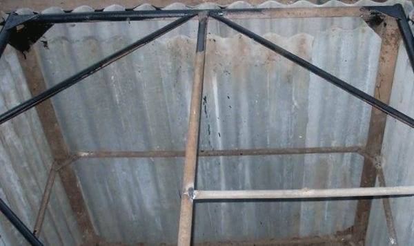 Если в хозяйстве лежит без дела старый шифер, то проблему с погребом можно считать решенной. Сделав каркас из уголка или труб, его опускают в подготовленный котлован. После этого листы шифера крепят саморезами к профилю.