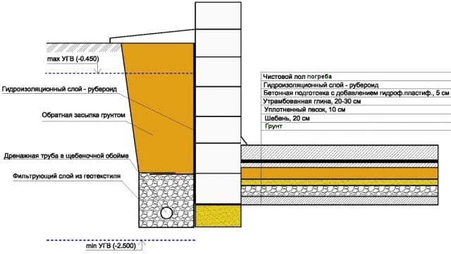 Вместе с увеличением глубины дачного лабаза обостряются проблемы, свойственные всем подземным сооружениям: необходимость качественного дренажа, гидроизоляции стен и перекрытия. Для их решения по периметру котлована выкапывают траншею, наполняемую щебнем и песком. Этот резервный «карман» соберет избыточную влагу, попавшую в грунт после таяния снега или сильных дождей. Обратную засыпку стен выполняют не землей, а щебеночно-песчаной смесью, отводящей воду в дренажную траншею.