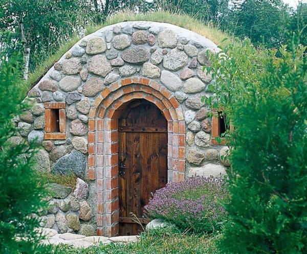 Оригинальный внешний вид наземного погреба нравится любителям альпинариев и других миниатюрных «горных массивов», создаваемых на даче.