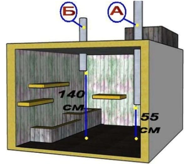 Влажность в хранилище регулирует простейшая система естественной вентиляции. Она состоит из длинной приточной трубы и короткой вытяжной.