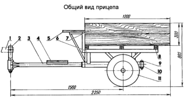 1 — кронштейн навески мотоблока; 2 – поворотная консоль, 3 – водило; 4 – подножка; 5 — сиденье (доска 20мм); 6 – рама прицепа; 7 — борт кузова из доски 25 мм; 8 — опорная балка рамы (брусок 50×50мм); 9 – фиксирующий болт шарнира М8; 10 – задний шарнирный узел; 11 — колесо