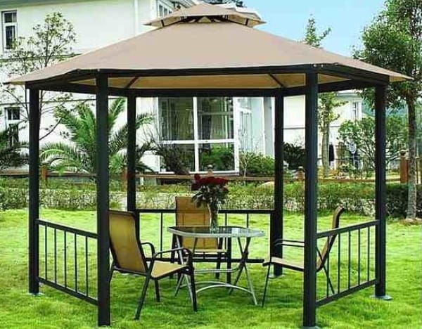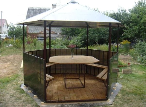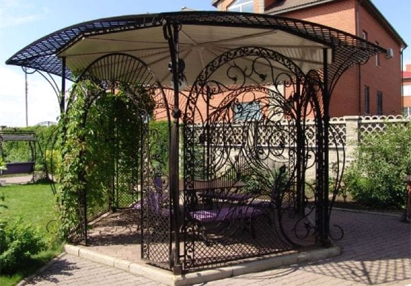 Тот, кто не уверенно чувствует себя в роли конструктора, может купить беседку из металла. Полная готовность и прочный тент на крыше – очевидные достоинства такого решения.