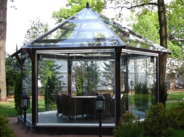 Металл прекрасно смотрится со стеклом не только в офисных зданиях, но и в дачной беседке. Остекление стен и крыши делает постройку легкой и солнечной. Такая оригинальная «стеклянная шкатулка» прекрасно впишется в пейзаж любого участка. Легкая нотка официальности, присущая союзу стекла и металла, задаст нужный тон деловой встрече.