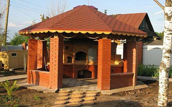 Рассказывая о шестиугольных конструкциях, мы забыли упомянуть кирпич. Этот материал не так часто, как древесина и металл используют для строительства. Из кирпича возводят беседки большого формата, оборудованные мангалом, барбекю и варочной печью.