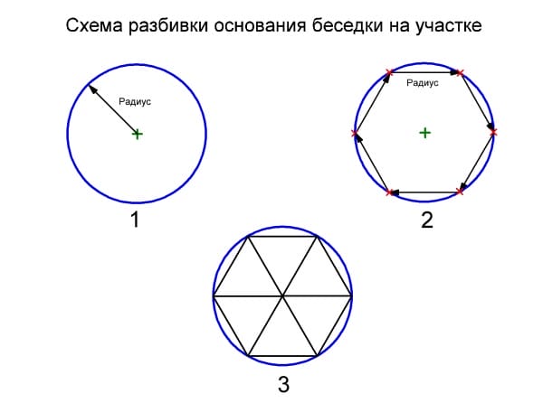 - В любой точке окружности забиваем один колышек, а вторым делаем на ней засечку. Пройдя по всему контуру, мы получим 6 точек. Это углы нашей будущей беседки (схема №1).