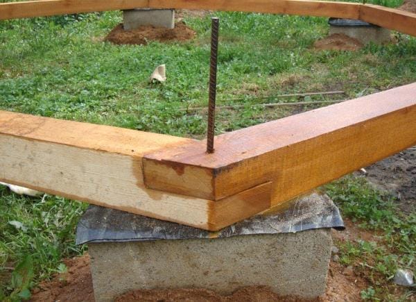 Для лучшей связи блоков с деревянной рамой пола в их пустоты забивается арматурный стержень. Стыки антисептированного бруса (сечение 15х10 см) соединяют способом «внахлест» и насаживают на арматуру.