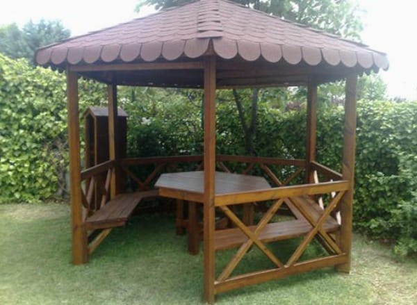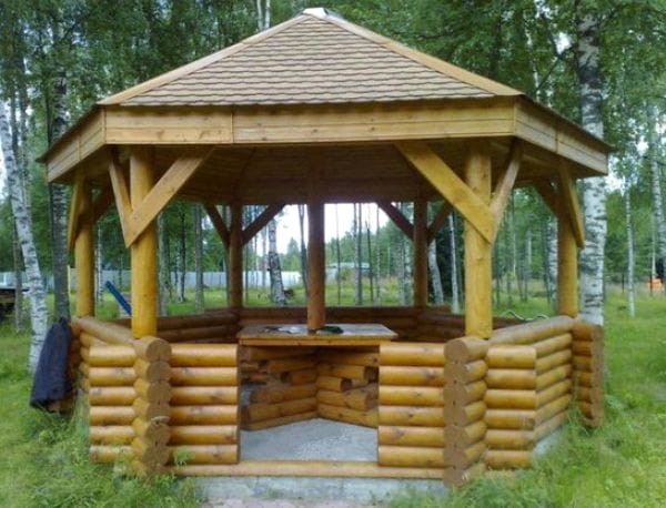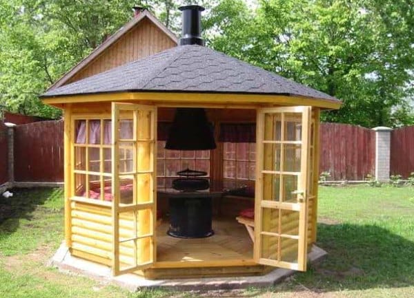 Если вам хочется любоваться красотой живого огня, то вместо стола в центре такой беседки можно сложить открытый камин или установить металлическую жаровню с вытяжкой.