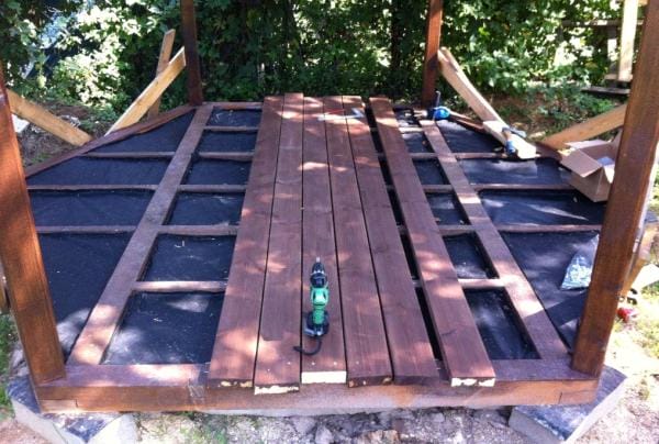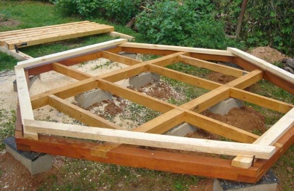 Завершающий этап строительства – укладка половой доски (палубной или шпунтованной). Для защиты от сырости грунта «соты» опорных брусьев зашивают пароизоляцией.