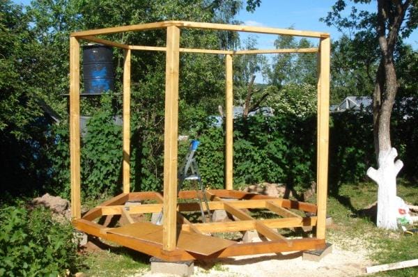 Каркасный вариант более демократичен, поскольку не требует специальной обработки кругляка. Два десятка строганных брусьев, половая доска, плиты ОСП, кровельный материал, шуруповерт и ножовка – вот и все что нужно для самостоятельной работы.