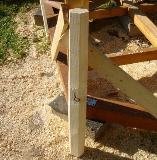 К верхнему поясу обвязки крепится доска (50х100 мм), а в ее центральной части вертикально устанавливают шестигранный столбик. В него будут упираться стропила крыши.